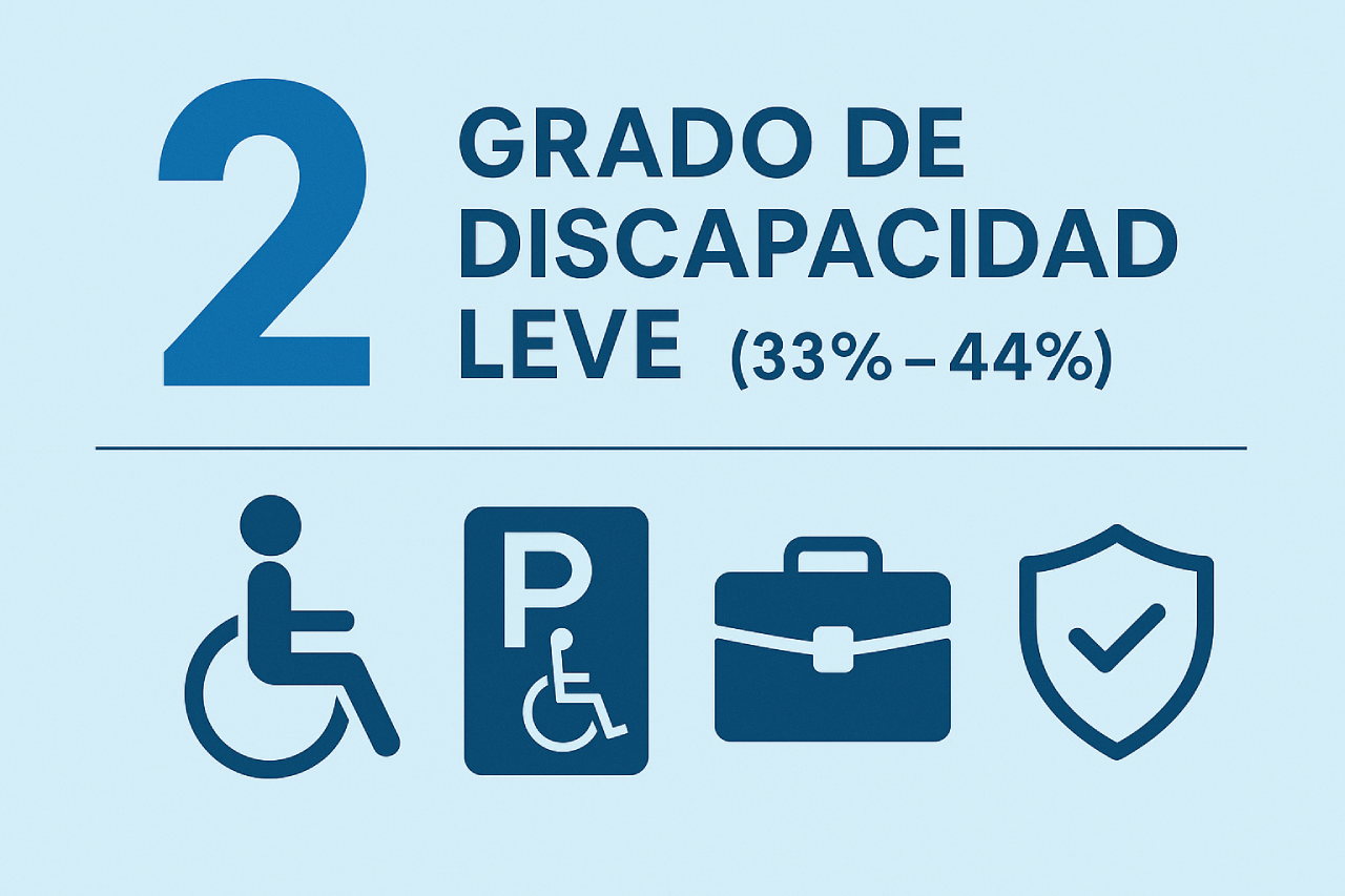 Se considera grado 2 a la discapacidad leve con un porcentaje en el intervalo del 33%-44%, según el baremo nacional contenido en el Anexo I del Real Decreto 888/2022. A efectos legales, este es el umbral mínimo para ser considerado persona con discapacidad y, por tanto, acceder a algunas ayudas y derechos específicos.